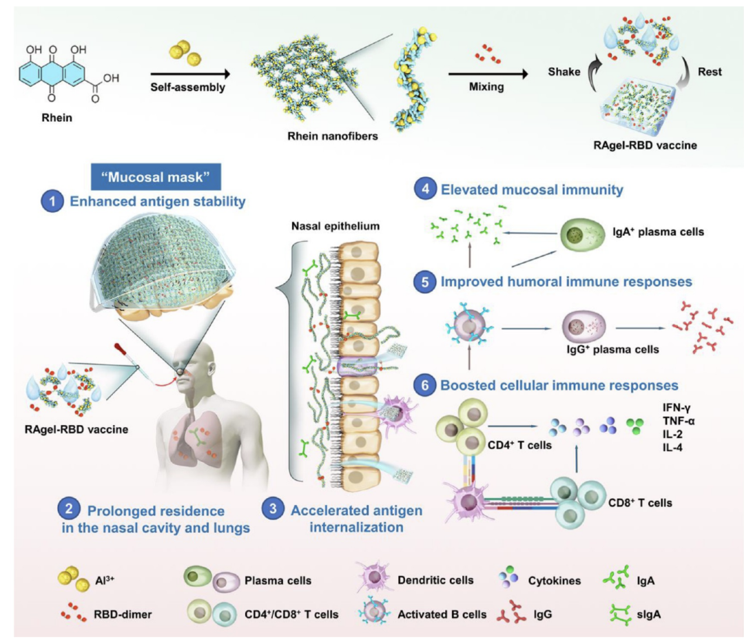 图1展示了一种新型的鼻内免疫策略,即使用具有可逆应变依赖性溶胶-凝胶转变特性的自修复水凝胶疫苗(RAgel-RBD疫苗)来激发针对呼吸道病毒的保护性免疫。该疫苗通过精确调控天然药物大黄素与铝离子之间的自组装过程,形成一种高度生物粘附性的水凝胶,能够在鼻粘膜表面形成“粘膜口罩”,从而增强抗原的稳定性并延长其在鼻腔和肺部的停留时间。此外,RAgel-RBD疫苗还能够刺激包括抗原内吞、交叉呈递和树突状细胞成熟在内的卓越免疫增强效应,并招募免疫细胞到鼻粘膜和鼻相关淋巴组织(NALT),同时增强抗原特异性的体液、细胞和粘膜免疫反应。这些特性使得RAgel-RBD疫苗成为一种有前景的策略,用于制备针对传染病或癌症的鼻内疫苗。