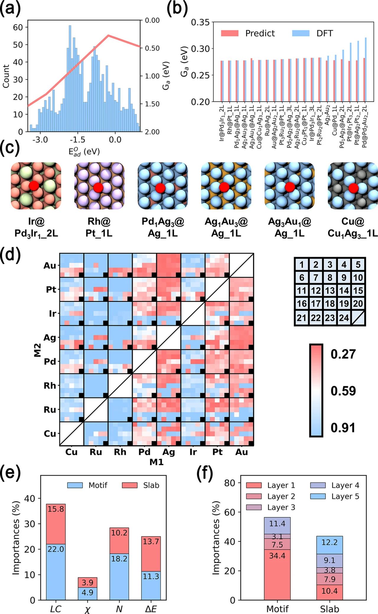 在此研究中,为了解决这一问题,作者通过仔细分析纯金属纳米颗粒的催化反应网络,建立了鲁棒的线性关系,从而在活性和O*吸附能之间建立了火山状相关性。此外,还引入了一种通用的结构描述符,能够捕捉晶格常数、电负性、原子序数和吸附能等基本特征,该描述符已被证明可以有效地将这些特征转化为吸附能的准确预测。