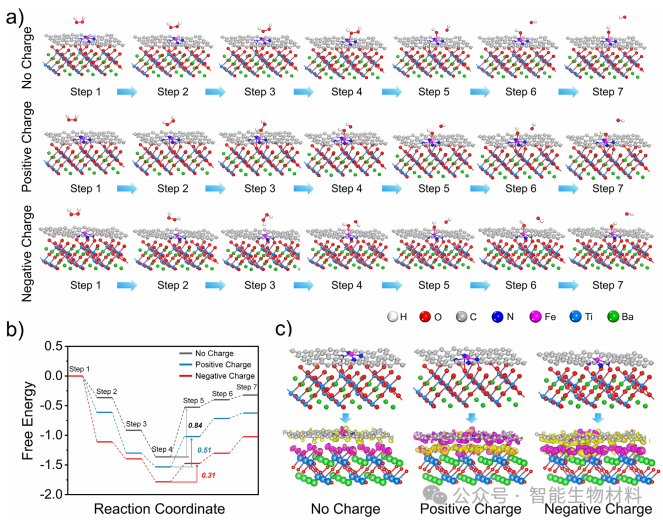 图4. 通过密度泛函理论(DFT)计算,揭示了压电电荷对单原子铁位点催化活性的影响机制。计算结果表明,正负电荷均能降低H₂O₂分解的能量障碍,显著增强BFTM的POD活性