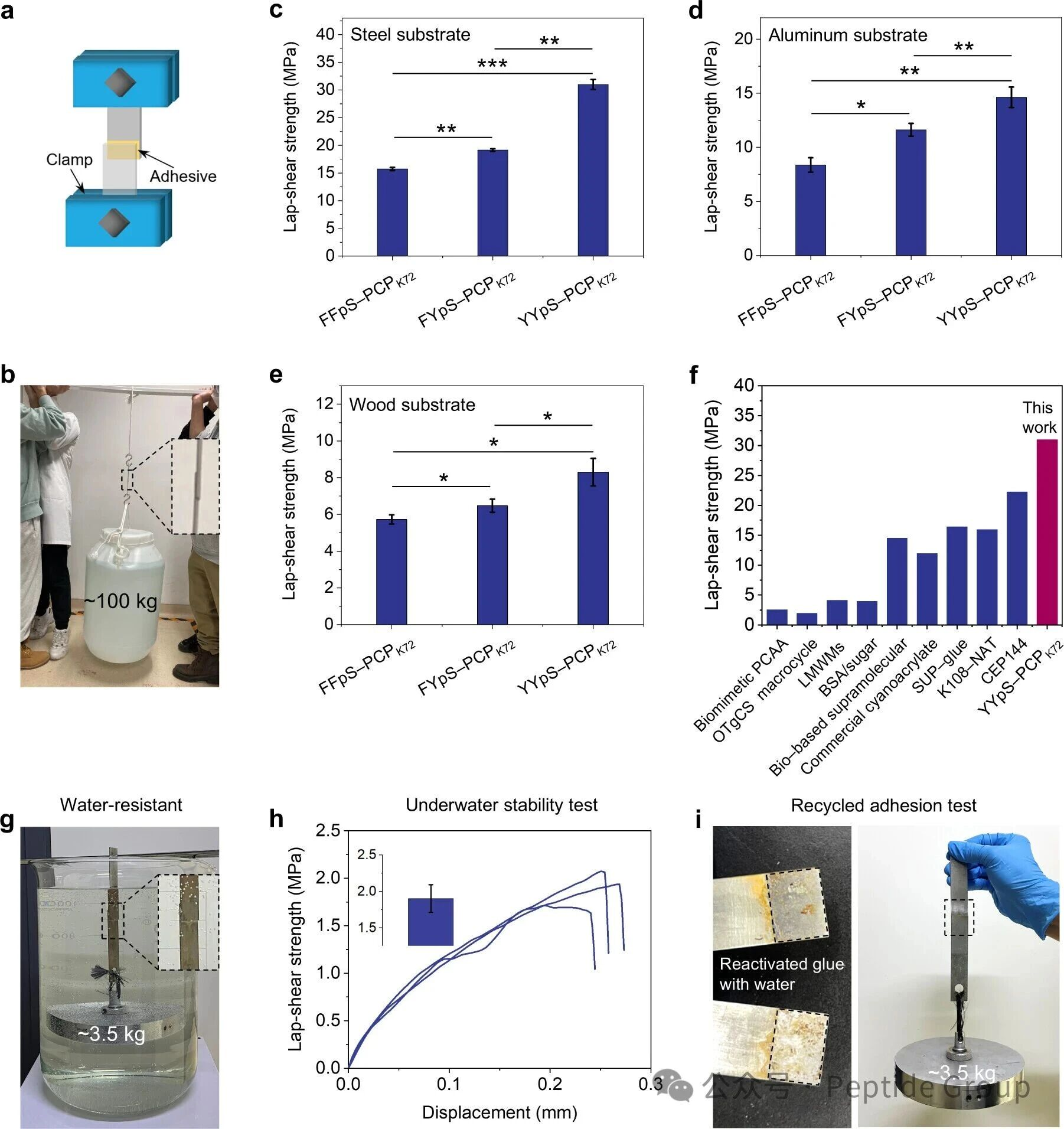 随后,作者在干燥条件下,通过单轴拉伸试验评价了三种粘合剂的粘附性能(图2a)。FFpS−PCPK72、FYpS−PCPK72和YYpS−PCPK72粘合剂在钢基材上的搭接剪切强度分别约为16、19和31MPa(图2c)。值得注意的是,YYpS−PCPK72粘合剂的平均搭接剪切强度超过了大多数报道的超分子粘合剂,甚至超过了交联型化学粘合剂(图2f)。进一步实验显示,该粘合剂能将两块钢板牢固粘合到足以承受约100 kg重物,展示了YYpS−PCPK72粘合剂非凡的粘附性能(图2b)。此外,三种多肽−PCPK72粘合剂对铝材和木材基材也表现出很强的粘附性(图2d、e),显示了它们对各种粘附界面的普遍适用性。此外,我们还进一步评价了YYpS−PCPK72粘合剂的水下稳定性和可重复使用性能。YYpS−PCPK72粘合剂(粘附面积为2×1.5 cm)在水中浸泡12h后仍能承受3.5公斤的载荷(图2g),显示出其水下粘附稳定性。YYpS−PCPK72粘合剂在水中暴露1小时后,其搭接剪切强度保持在1.9 Mpa(图2h)。回收的YYpS−PCPK72粘合剂也表现出很好的粘附行为(图2i),这归因于粘合剂中动态和可逆的非共价力。