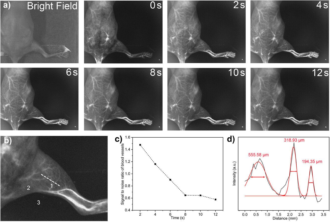 图5. 全身血管成像的结果,证明了Ln-DSPE在1525 nm发射下能够实现高分辨率的血管成像,能够清晰区分小血管,并具有良好的时空分辨率。