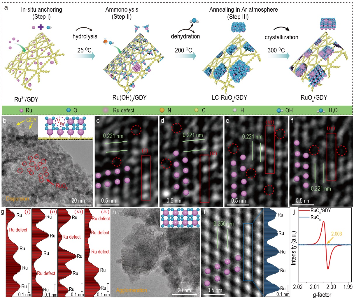 图1 RuOx/GDY的合成及形貌表征。(a)RuOx/GDY的合成及RuOx/GDY随温度升高的结构演化过程示意图;LC-RuOx/GDY:低结晶的RuOx/GDY。RuOx/GDY的(b)TEM和(c-f)HRTEM图像。(g)红色高亮红色区域对应的原子强度分布图。(h)纯RuOx的TEM和(i)HRTEM图像以及蓝色高亮区域对应的原子强度分布图。(j)RuOx/GDY和RuOx的EPR谱。