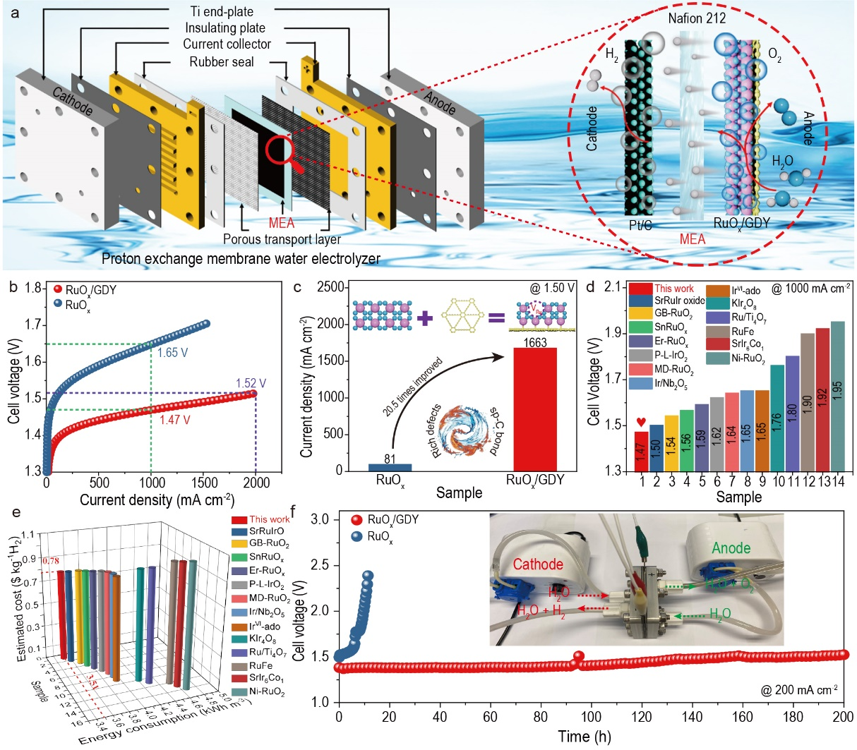 图4 PEMWE器件性能。(a)PEMWE装置的结构模型和膜电极组件(MEA)中水裂解的反应机理;(b)RuOx/GDY和RuOx阳极电解槽的极化曲线;(c)在电池电压为1.50 V时,RuOx/GDY和RuOx的电流密度比较(d-e)在1000 mA cm−2时,不同催化剂下RuOx/GDY的电池电压、器件效率、能耗和预估成本的比较;(f)RuOx/GDY||Pt/C和RuOx||Pt/C在200 mA cm−2下的稳定性曲线(插图:PEMWE装置的光学图像)。