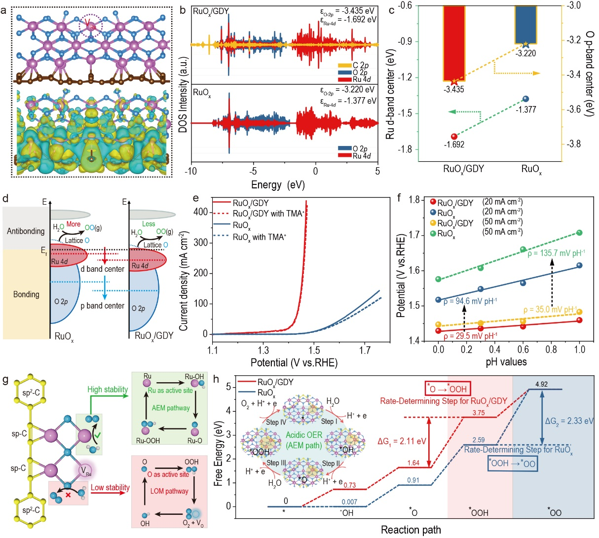 图5 反应机制。(a)含有Ru原子缺陷的RuOx/GDY的结构模型(上)和差分电荷密度(下);(b) RuOx/GDY和RuOx的DOS图;(c)RuOx/GDY和RuOx中Ru 4d能带中心和O 2p能带中心的比较;(d)RuOx/GDY和RuOx的能带结构示意图;(e)在0.5 M H2SO4中加入0.05 M TMA+和未加入0.05 M TMA+时RuOx/GDY和RuOx的OER极化曲线;(f)RuOx/GDY和RuOx在20 mA cm-2和50 mA cm-2下OER电位的pH依赖性;(g)RuOx/GDY的OER机制方案;(h)RuOx/GDY和RuOx上OER的吉布斯自由能图。