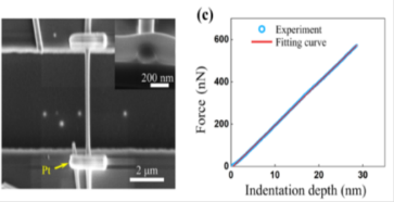 (左图)利用FIB固定待测纳米线;(右图)力随着压痕深度的变化曲线。