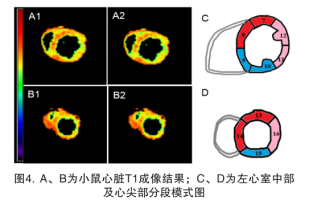 心肌T1值计算技术具有无创检测和评估心肌组织特征的能力,可用于评估心肌梗死、弥漫性心肌纤维化、淀粉样变、心力衰竭等疾病。但使用常规T1_mapping序列存在严重运动伪影,导致无法准确获得心肌T1值。为此,中心技术发展部技术人员通过优化序列及T1时间(图1),以克服运动伪影带来的信号损失,并可简化计算参数。例如采用3-5翻转角的CINE序列进行心肌T1值定量检测,如图2所示,实现了小鼠左心室不同层面的T1成像。此外中心的小动物核磁共振成像仪(BS-70) 配备7.0T主磁场强度、大/小鼠体部容积线圈、大/小鼠头部表面线圈,可以实现动物全身主要脏器及脑补的高分辨(分辨率可至100 μm)成像、药物代谢及活体分布分析、心脏磁共振成像检测、血管成像检测,为新型纳米造影剂研发及动物疾病模型活体分析提供临床前的研究手段,特别适合用于小鼠模型心肌微观结构研究。