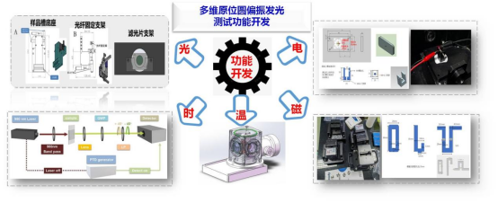 通过系统设计、集成外围光路优化和多功能样品台研制等手段,成功引入激光激发、电场、磁场、时间分辨及变温条件等多种原位调控方法,构建了一套综合性强、调控灵活的原位CPL表征系统。