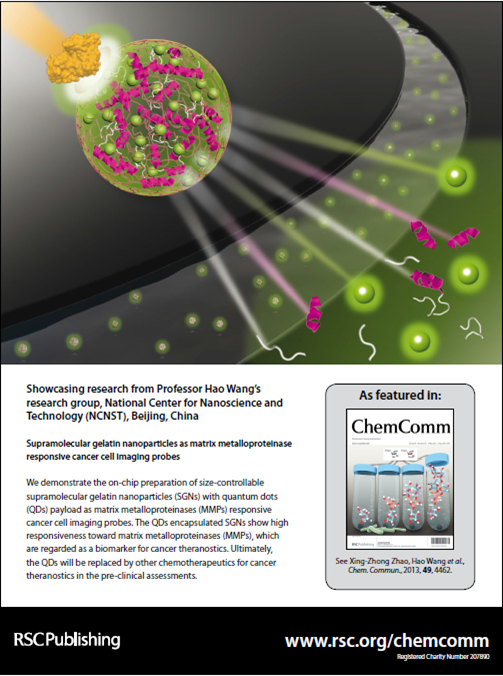 [10]. Supramolecular Gelatin Nanoparticles as Matrix Metalloproteinases Responsive Cancer Cell Imaging Probes. Jun-Hua Xu, Fu-Ping Gao, Xuefeng Liu, Qian Zeng, Shi-Shang Guo, Zhi-Yong Tang, Xing-Zhong Zhao* and Hao Wang*.