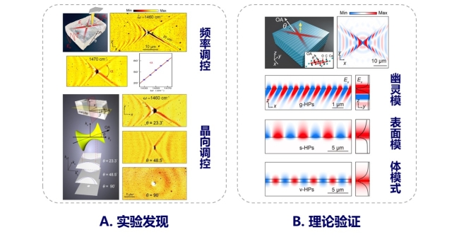 图1. 方解石“幽灵”声子激元的实验及理论研究:A.方解石声子激元的频率及光轴色散特性;B. 方解石“幽灵”声子激元的模式分布