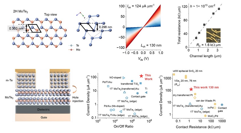 团队研究发现,单斜相P21结构的金属碲(m-Te)可在二碲化钼(MoTe2)的晶格诱导作用下取向生长。将其用作MoTe2二维场效应晶体管的P型电接触材料时,得益于匹配的能级位置、弱的金属诱导态和原子级陡峭的接触界面,P型接触电阻低至1.6 kΩ μm。在130 nm沟道长度下,器件开态电流密度高达124 μA μm-1,最大开关比为107,综合性能处于已报道的P型二维场效应晶体管前列。该工作为优化二维过渡金属硫族化合物晶体管接触提供了原位生长金属相硫族元素的新方向。